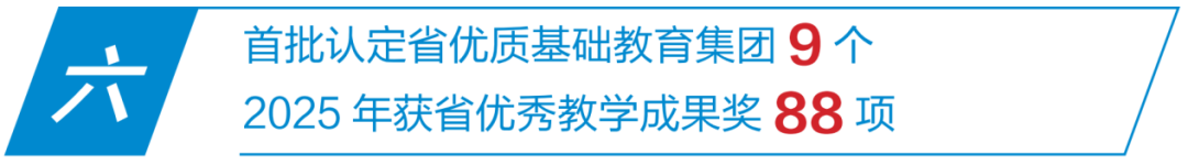 在资源共享、联动合作下,教育教学成果突出。五年培育50个省基础教育教研基地;2025年获省优秀教学成果奖88项,其中基础教育类39项,含特等奖5项、一等奖20项、二等奖14项,特等奖、一等奖以及总获奖数量均位居全省前列。