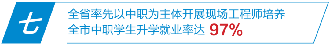 精准对接人工智能、电子信息、机器人、智能制造、网络安全、新能源汽车等重点产业一线技术需求,认定43个市高水平校企合作基地,组建37个产业学院、16个职业教育集团(联盟),建设7个行业产教融合共同体、1个市域产教联合体;成功建成5所省高水平中职学校,其中2所在期满验收中被评为优秀。全市中职学生升学就业率达97%。