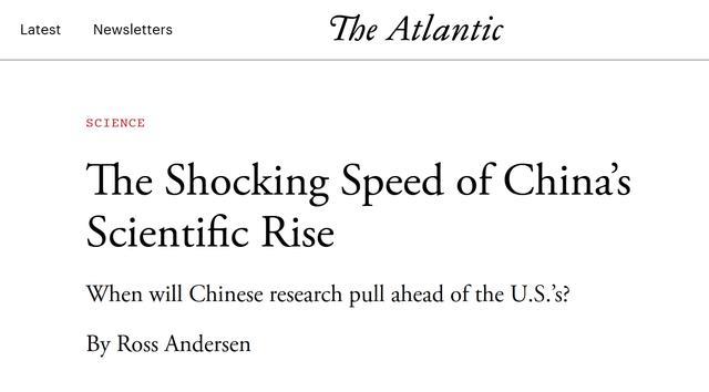 《大西洋月刊》表示,过去近十年,中国科学家发表的论文数量也已超过美国,还有一些论文在发表后很久才获得引用,被称为‘沉睡的美人’(这意味着国外远远低估了过去的中国科研质量)。而现在中国的优质科学论文不止是引发全球学界的关注,更是在很多领域正主导前沿科学。